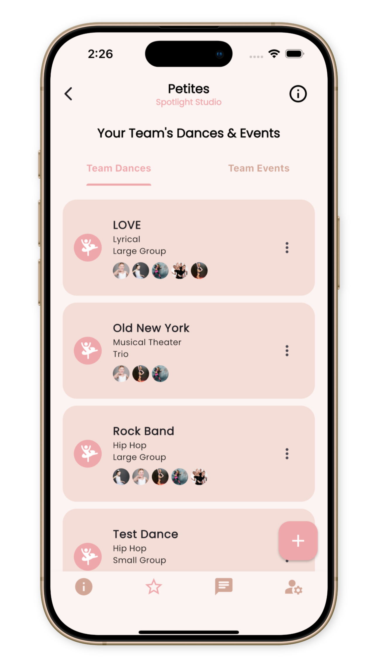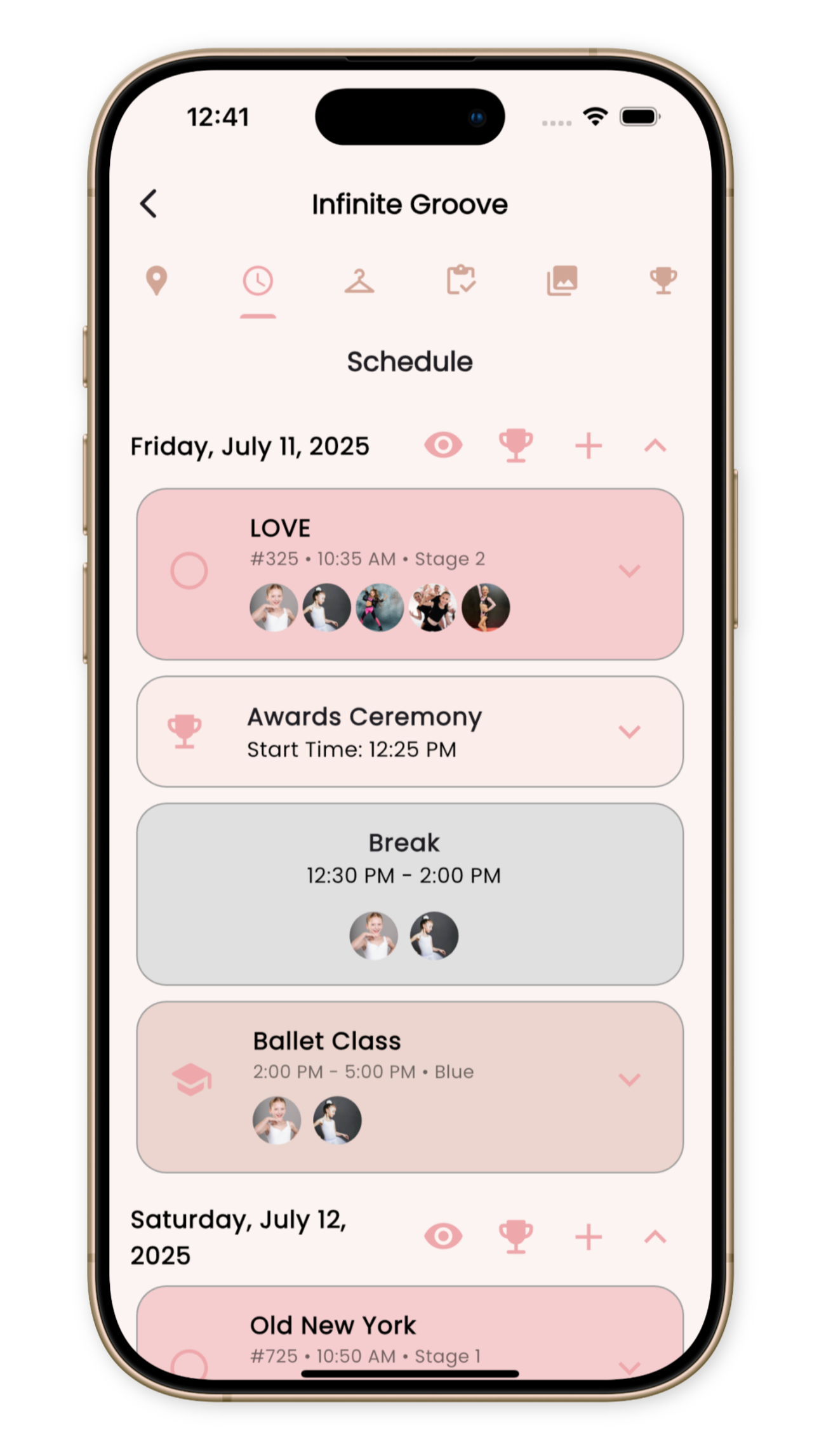 The all-in-one dance app that makes competition season stress-free. Add and share dances, collaborate with your team, update costumes and events, and stay organized with customizable packing lists. Connect instantly with dance moms and teammates through a built-in chat feature, while keeping solos private and group dances shared seamlessly. Search popular competitions and conventions, capture special moments with photo uploads, and manage everything from classes to awards in one clean, modern interface.
